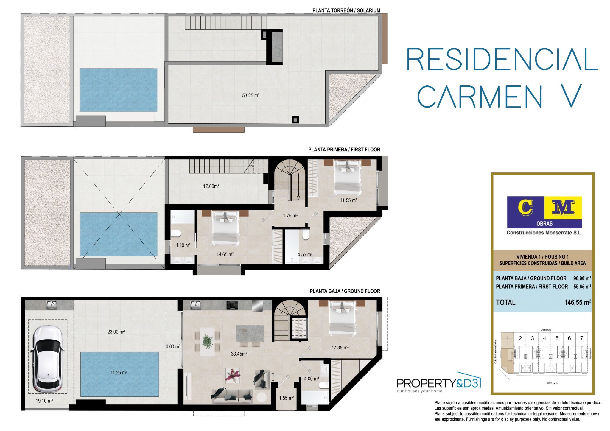 Residencial Carmen V is a complex composed of 7 ample townhouses, with private pool, terraced area parking space within the plot and solarium for each unit.