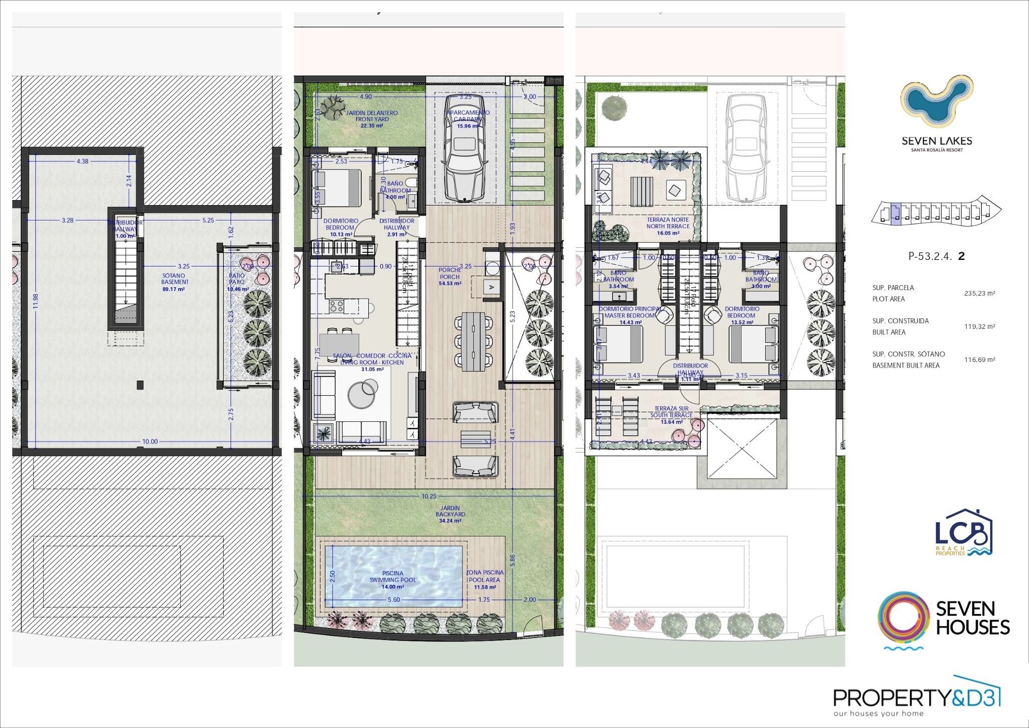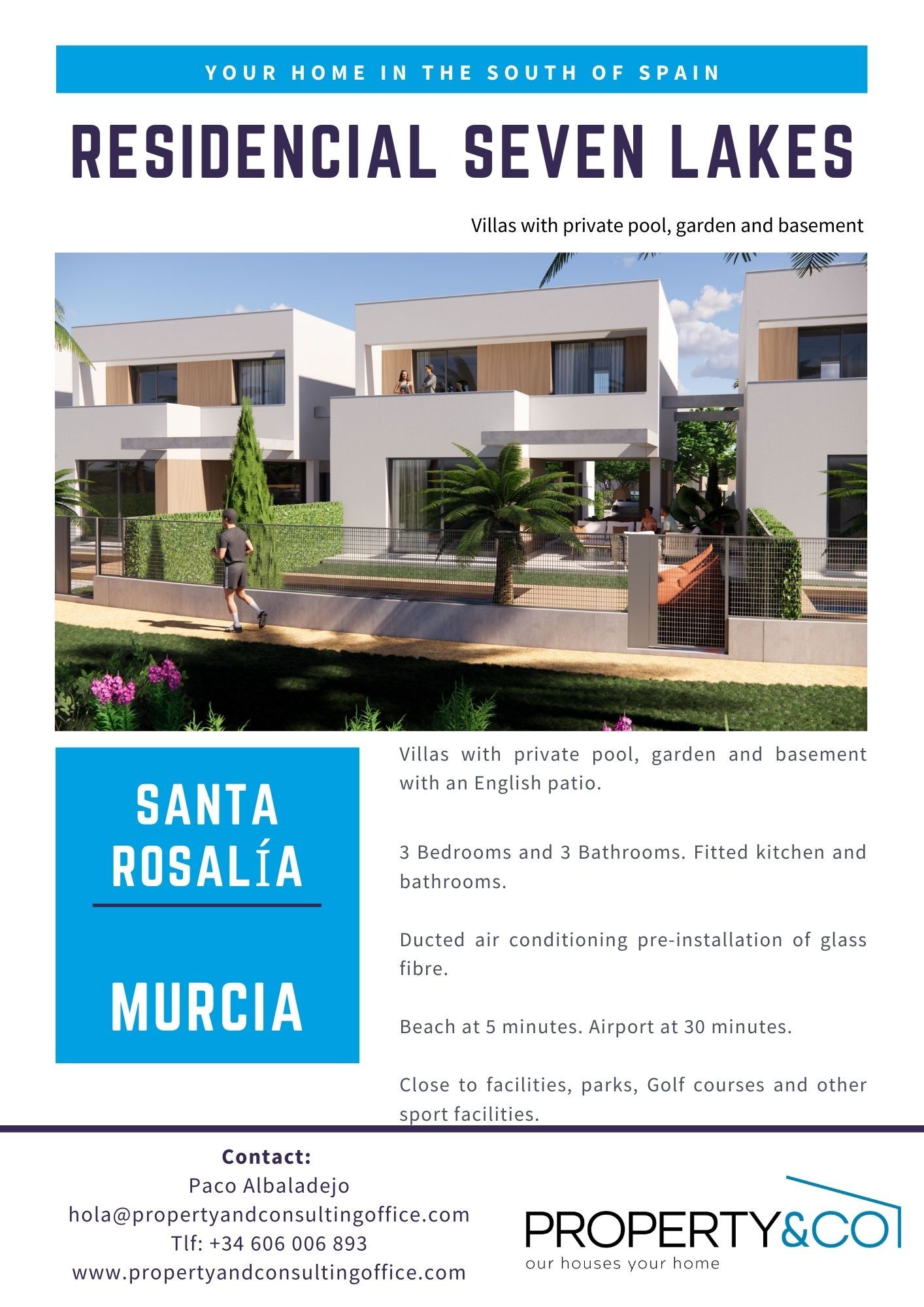 Residencial Seven Lakes is a magnificent residential of 11 villas with 3 bedrooms, 3 bathrooms, garden, private pool and basement with an English patio, and parking space on the plot. Located in the exclusive complex Santa Rosalia Lake and Life Resort offers all the services to make the most of this privileged site of the Costa Cálida.